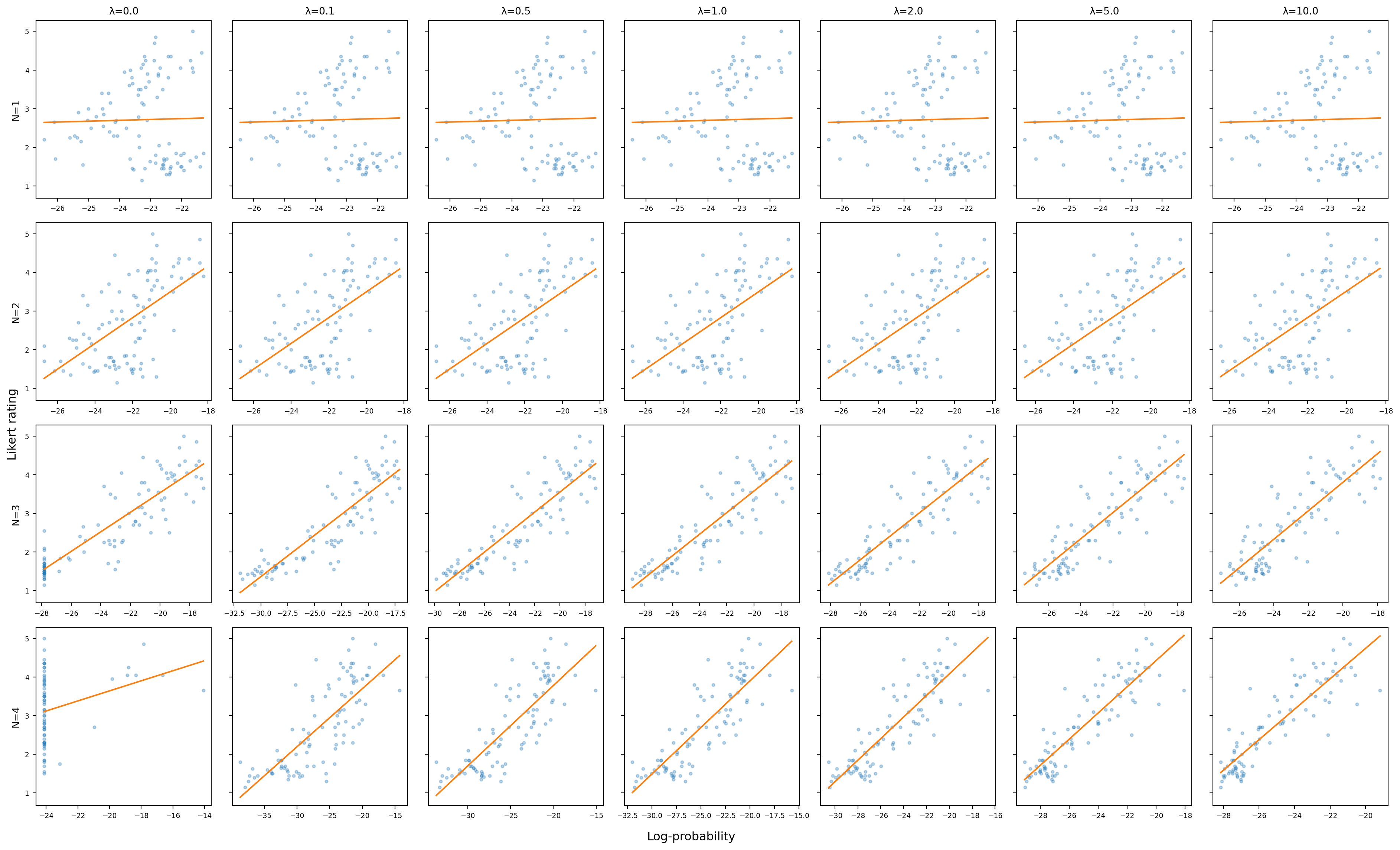 The following plot shows the relationship between log-probability and acceptability rating for each combination of $N$ and $\lambda$.