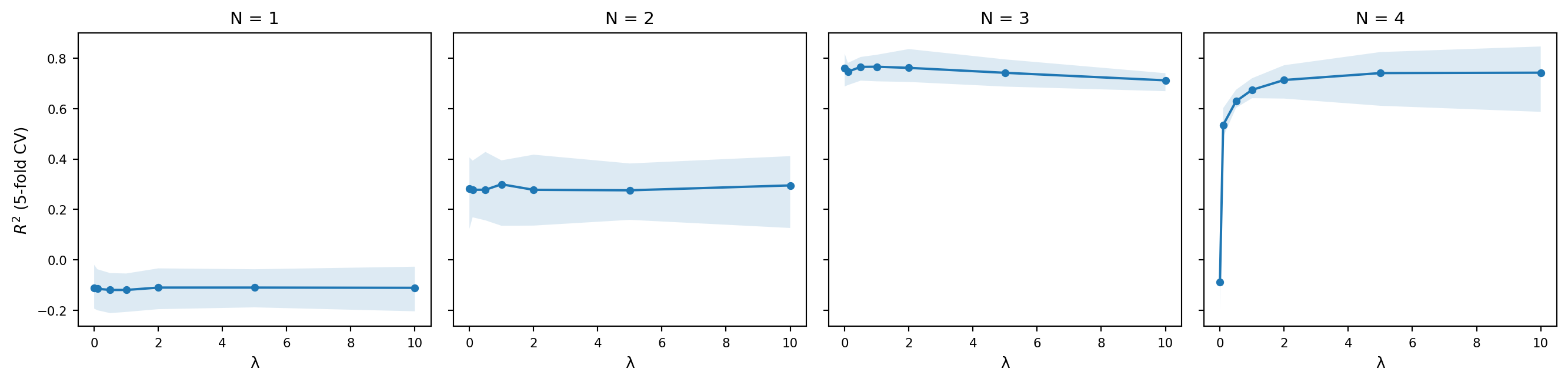 And the following plot shows the cross-validated $R^2$ as a function of $\lambda$ for each value of $N$, with bootstrap confidence intervals.